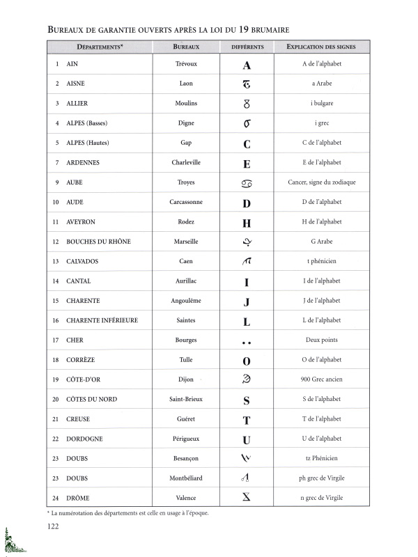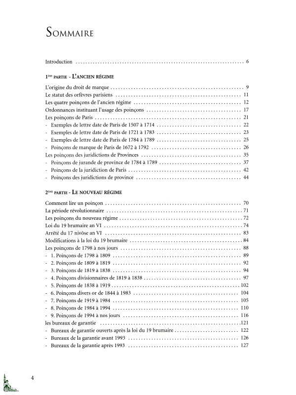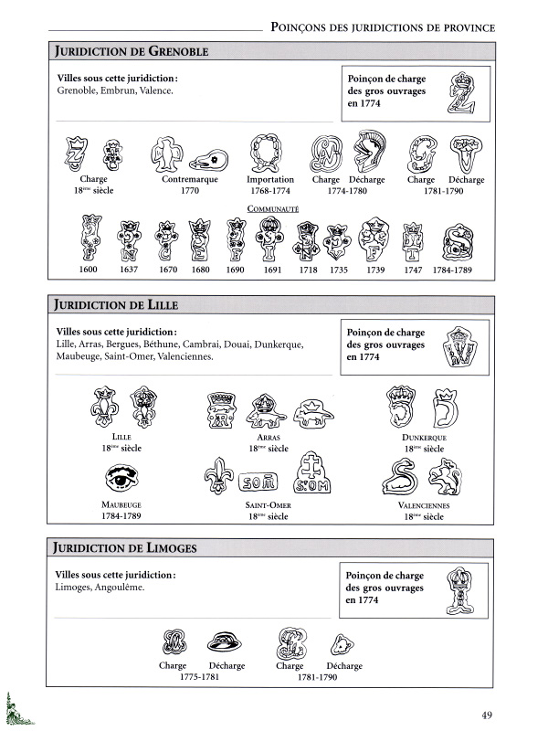 After presenting the hallmarks, jurande, charge and discharge marks used under the Ancien Régime, he reviews the hallmarks in use since the Revolution. A final section addresses the marking rules, which determine the placement of the hallmark depending on the object.